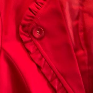 Blazer with front buttoned lapels and ruffled front hem. Attached with hook in front. 65% Cotton, 33% Polyester, 2% spandex