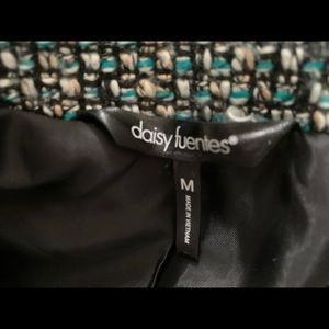 Classic wool blend short blazer. Colors are teal, beige and black with goldish and white specks. Small pull on one sleeve, shown in picture.