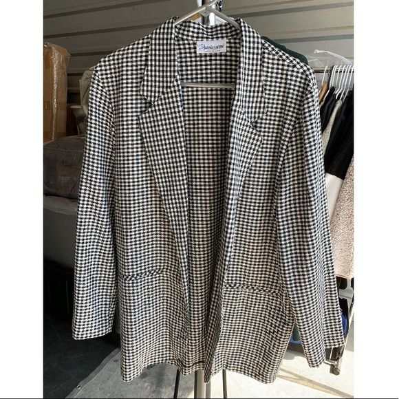 Similar to a “houndstooth” pattern. Very cute for both laid back outfits and professional looks. There is no size tag but I would say this fits like a large.