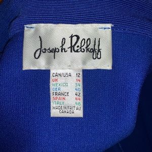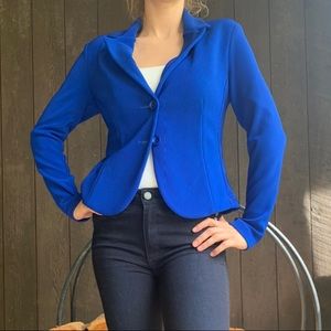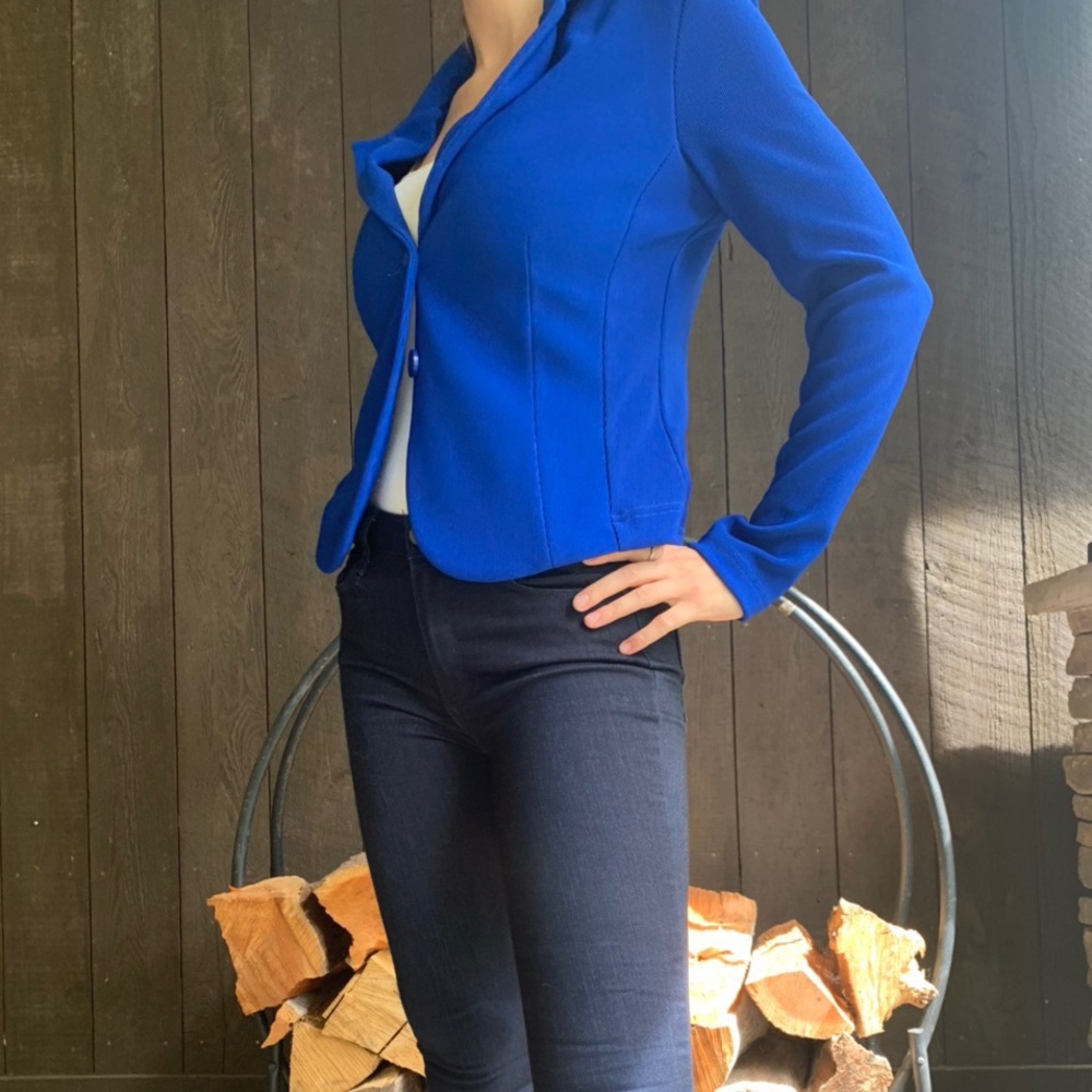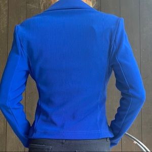 Joseph Ribkoff blue, medium weight work jacket. Form fitting, not too loose. Designer, does not wrinkle, GREAT for traveling. FITS SIZE 8 better