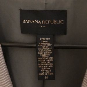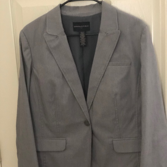Light weight lined blazer. Two buttons. Falls to lower hip. Gray with fine white stripe, overall appearance is light gray.