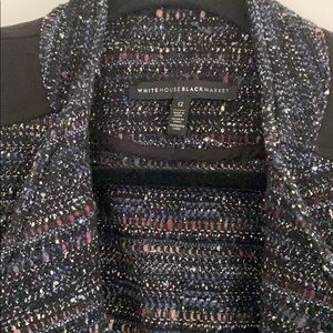 White House Black Market size 12 women’s blazer. Tweed jacket with navy purple and light blue threading. Stretchy fabric under arms for easier fit