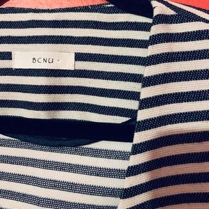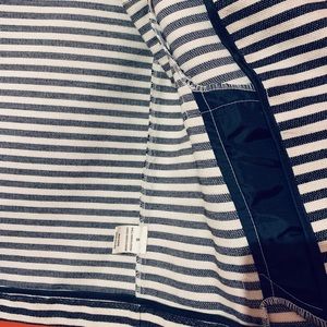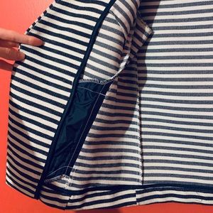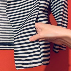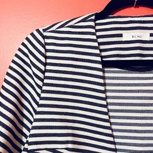 BCNU Navy/White Stripe Blazer. Angled lapels & open front. Waistline detail; overall cropped & well fitted!! 3/4 length sleeves. Very stylish & refreshing! Will go very well with numerous things. Condition- NEW!
