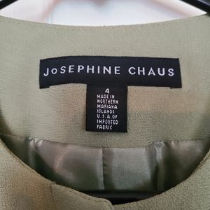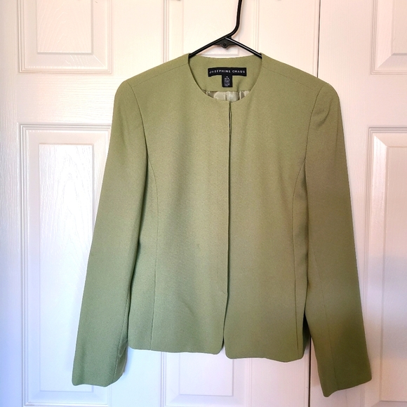 Hip length stylish blazer. Can be casual with jeans or business as well. Hidden buttons closure in front, no collar, buttons on sleeves.