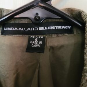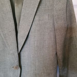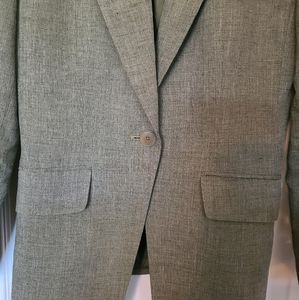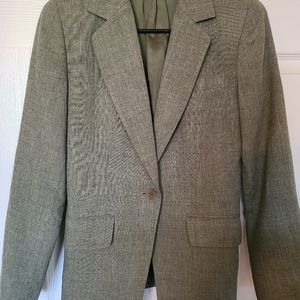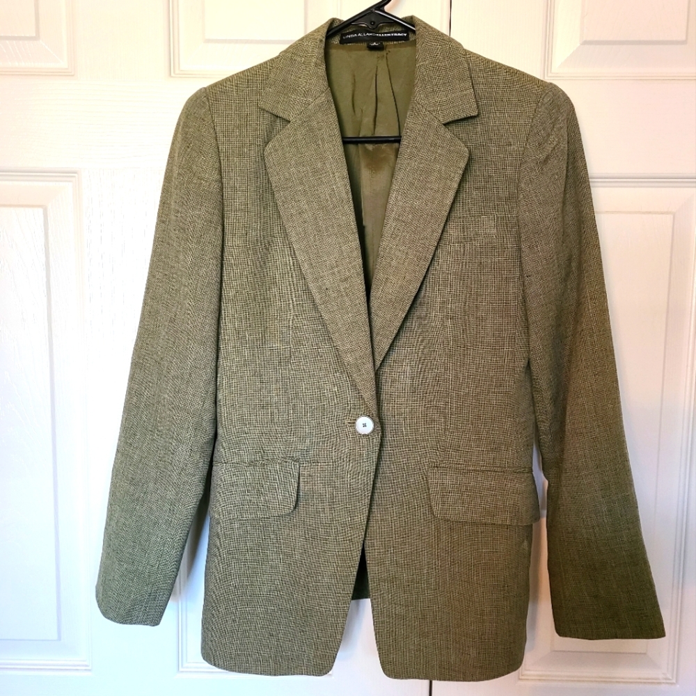 Classic Blazer, one button, English style collar, front pockets, buttons on sleeves. Nice olive color. Wear it to the meeting or with jeans.