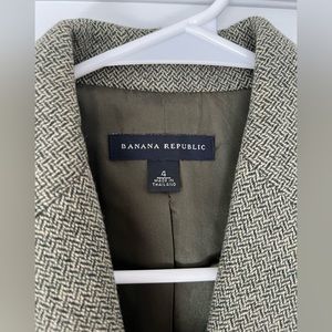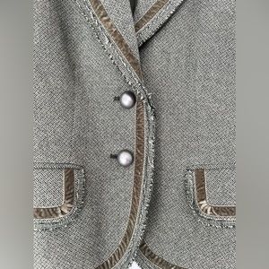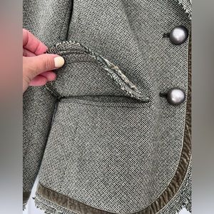Tweed, vintage-style. Moss green color with piping. Lined, pockets. Military-style buttons. One of a kind blazer!!!
