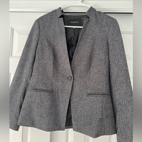 Collarless, charcoal gray blazer. Pockets. Comfortable feel. Classic work piece!!!