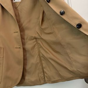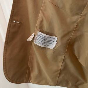 A vintage tan-colored blazer, made in Korea, as a size 5. Fits between a US size 0 to 2. Long, deep pockets open and close with brown buttons. Can be machine washable and has a nice fit for the cinch waist detail, and the back with sturdy hemming. Great pair with slacks or jeans.