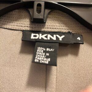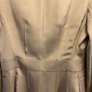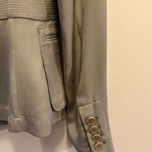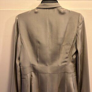 100% silk blazer, size 4. worn only once. Very light material, sage color. Below hip, tapered back and waist.