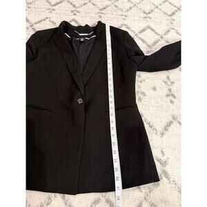 Classic and polished White House Black Market black tailored blazer featuring a sleek one-button front and structured lapel. Designed with a flattering silhouette and clean lines, making it perfect for work, business casual, interviews, or dressy occasions. A timeless wardrobe staple that pairs effortlessly with trousers, skirts, jeans, or dresses.