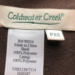 Rich Chocolate Brown, Open Front Blazer with a Subtle Ruffle at the bottom and the sleeves. Lined but very soft and light . 100% polyester-has a faux suede look to it making it appear exquisite!! Works wonderfully dressed up or down and perfect with the beautiful Coldwater Creek Midi Skirt also for sale in my closet!