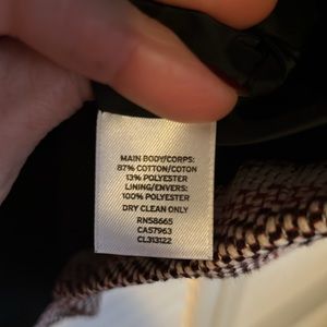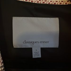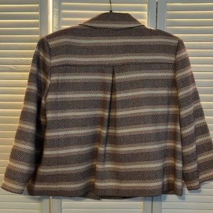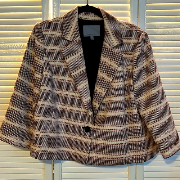 From Nordstrom a Classiques entier cropped ladies blazer/jacket, beautiful and flawless! Completely lined, side pockets, single button, cream/burgundy/black weave. Very retro!