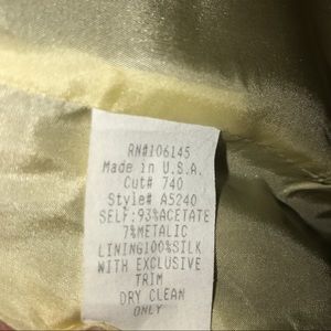 Gorgeous blazer in metallic gold size 2 ( fits more like a 4) Very well made in the USA. Has two button snap closures, fully lined, mocked front pockets. Euc worn 2-3 times. I will add measurements if needed. Smoke and pet free home.
