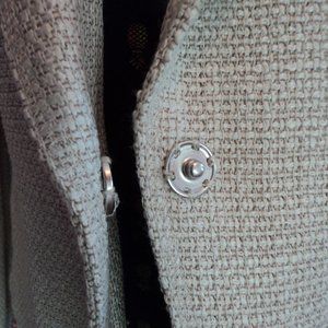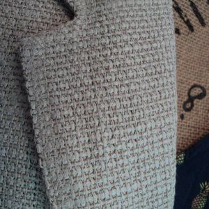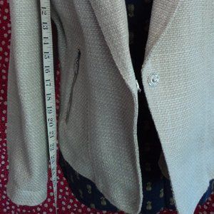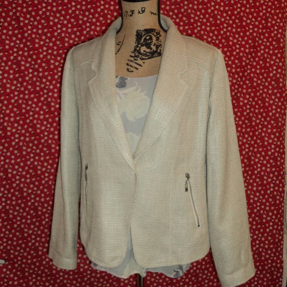Cream/Very Light Grey woven pattern, moto style inspired blazer/jacket. Color is muted and changes somewhat based on the lighting and what you place beneath it.