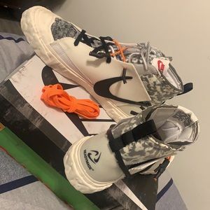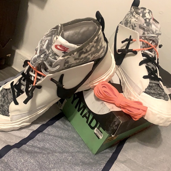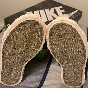White deconstructed collaboration of Nike and Japanese brand Readymade. Mid-top sits on a molded rubber midsole with 15% grind rubber from recycled material that would otherwise enter waste stream.