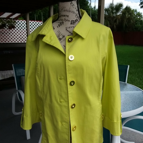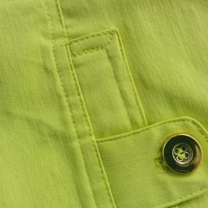 Green more like lime green .5 buttons down front and 2 buttons on side for pockets. They are not deep pockets. Worn about 3× excellent condition. Pet and smoke free environment. Oh and 2 buttons on back. See pictures.