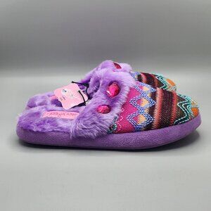 These slippers are new, still attached together with tag. Insides are faux purple fur. Toes are multicolored stripes with geometric embroidery. Large pink plastic rhinestones. Rubber purple sole.