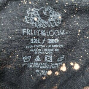 This 2XL Fruit Of The Loom t-shirt features a unique bleach-dyed design with a bold "Bone Daddy" graphic. Crafted from 100% cotton, it offers a comfortable fit while showcasing a distinctive style. Ideal for casual wear, this shirt stands out with its artistic splatters and expressive motifs.