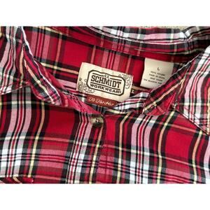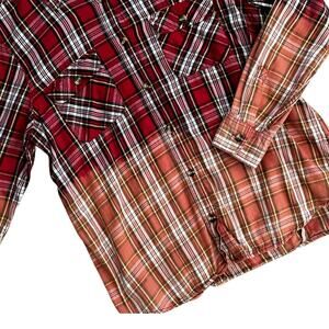 This is a bleach dyed red plaid shirt that I have altered myself. I bleach tie dyed this piece. It’s marked a size large from Schmidt Workwear.