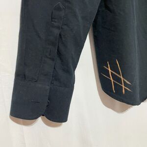 One-of-a-kind custom made navy blue button down mens shirt redesigned in house creating this outdoor forest design wearable art.