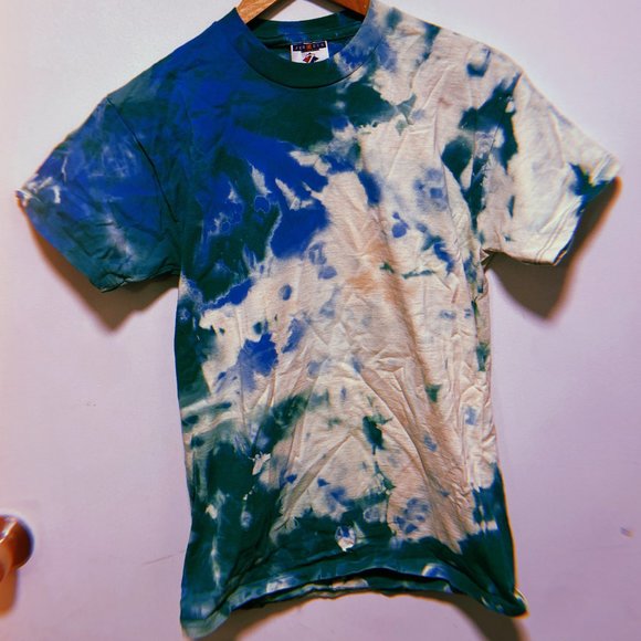 Blue & green bleach spotted tee, soft material, note that the filter makes the colors a bit more vibrant in the photos than in real life. Unisex Small.