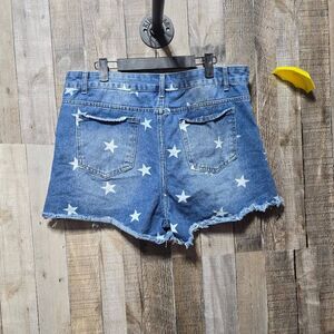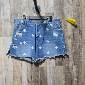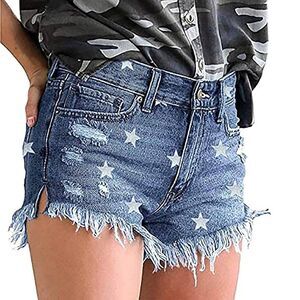 Details: factory distressed and bleach star look, little stretch, mid rise, zip fly, all over print, medium wash