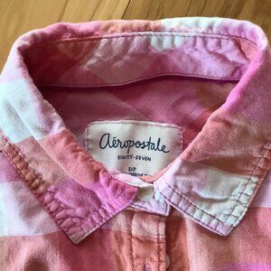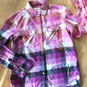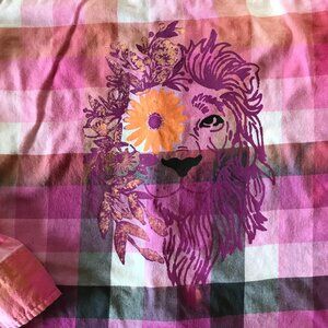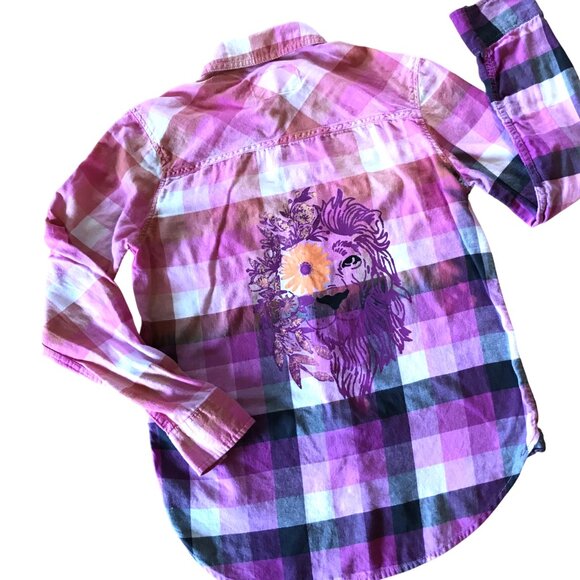 Bleached flannel shirt for women, size small petite, upcycled lightweight plaid shirt in pretty pinks and purples with hand painted fancy lion on the back. This cute shirt would be great for back to school this fall and winter or even as a unique Christmas gift!