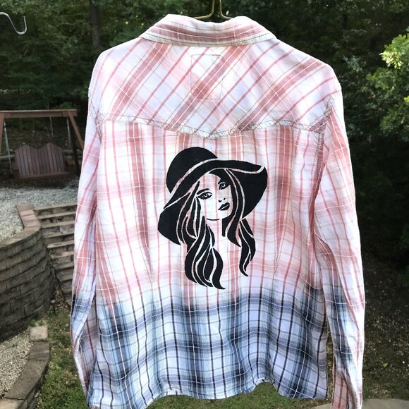 Painted bleached shirt for women, Junior size medium, plaid upcycled shirt with lady in a hat portrait painted on the back. This is a cute lightweight shirt that would be great for back to school or college this fall or next spring.