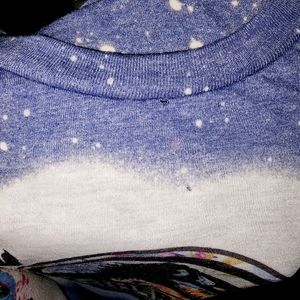 two very tiny holes from a tag being in the shirt. In the front colar and front neckline. Pictured above. Not noticeable if your not looking for it.