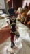 Unique gothic doll figurine with striking red and black striped stockings. Features a black corset and top hat. Holds a rose and a small doll.
