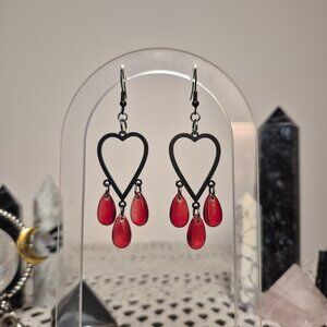 Romance meets heart break with this bleeding heart earring set. Featuring a black heart with black findings this set is perfect for any gothic-earring lover. The red drops symbolize the bleeding, and represent the heart break that balances the heart.