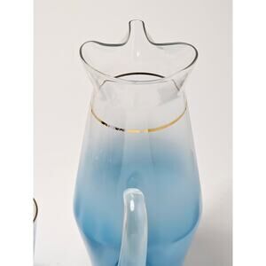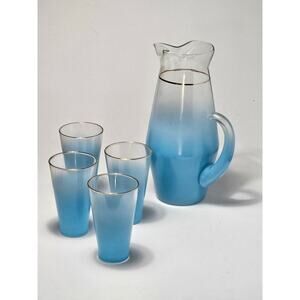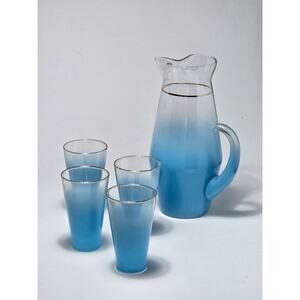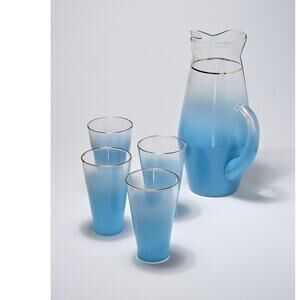 Add a touch of vintage charm to your table with this beautiful Blendo Gala Collection pitcher and glasses set! This set includes one pitcher and four matching glasses, all in excellent condition. Slight discoloration on the gold circle around the top of the pitcher - about 2-3 inches. The Blendo Gala Collection is known for its vibrant colors and elegant design, making it a highly sought-after collectible. Perfect for serving your favorite beverages or displaying as a decorative accent.