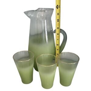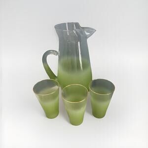 Add a touch of retro charm to your home bar or kitchen with this vintage Blendo glass pitcher and tumbler set. The set includes a frosted lime green pitcher and three matching tumbler glasses, all with gold trim. The glasses are beautifully crafted with a solid pattern and a round shape, perfect for serving drinks to your guests.