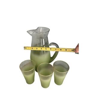 Blendo Glass Pitcher 3 Tumbler Glasses Lime Green Frosted Gold Trim Vintage MCM