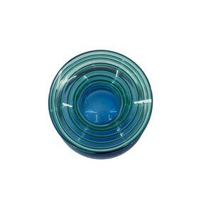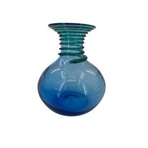 This hand-blown vase exemplifies the art of glass craftsmanship with its sleek blue hue and ribbed neck design. Its vibrant color and unique shape make it a distinctive piece for display or functional use. The vase stands at a height of 7.5 inches and has a top diameter of 3.5 inches.