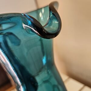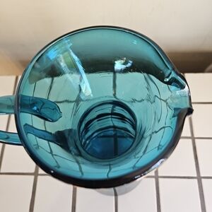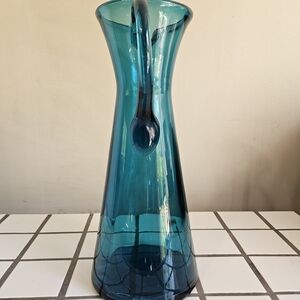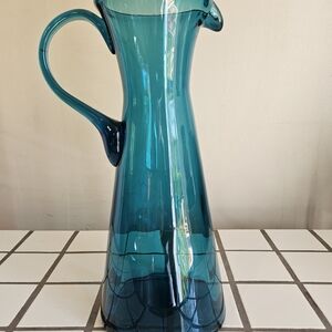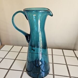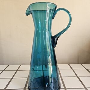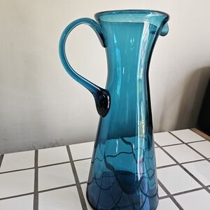 Hand-blown glass pitcher with a graceful handle. Lightweight glass construction for easy use and display. Ideal for serving or as a stylish decorative piece. 12 inches tall and 5 inches wide excluding the handle. No chips or cracks. Very beautiful 💙🩵