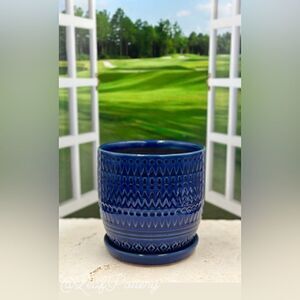 Dimensions: 6”H x 6”W, Opening 5.25”, weight 2lbs 6.5oz, Drainage hole, Made in China , Color: Blue , Materials: Ceramic, Type: Barrel Planter, saucer attached to the planter , Perfect for Indoor/Outdoor gardening, Don’t forget to dress up your plants 🪴