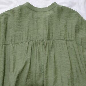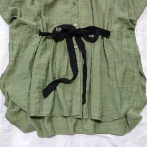 This loose-fitting blouse features a distinctive ribbon on the front.