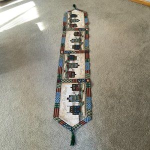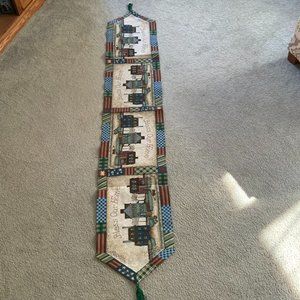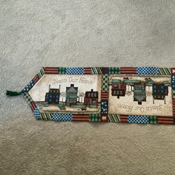 Bless Our Home Tapestry Table Runner NWT. Bright cheery design that repeats four times in opposite directions. Green tassle at each end. See photos.