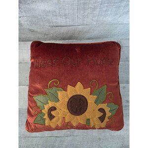 Bless Our House Orange Velour Sunflower Embroidered Throw Pillow 11"