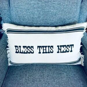 “Bless this Nest” black/dark gray and white farmhouse striped fringe edge rectangular throw pillow with zipper closure. Like new condition. Clean nonsmoking home.