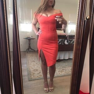 Bless'ed Are the Meek Mohawk Spicy Orange Bodycon Dress off-the-shoulder neckline (w/no slip strips) and a seamed bodice (w/hidden boning) that flatters and flaunts your figure. Thick, stretch knit bodycon skirt has an angular hem and side slit. Exposed gold back zipper. This dress is a size small US 4. I wear size US 0 & rarely US 2 -- So this dress fits like a glove if you're small.Worn once . Instagram : @blessed_are_the_meek