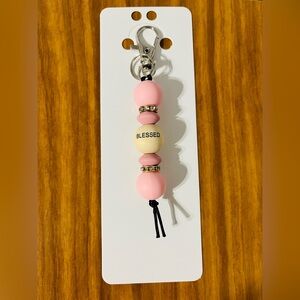 Material: stainless steel lobster claw clasp with .5” oring, silicone beads, rhinestone beads, wooden beads, nylon string. 4” total length.