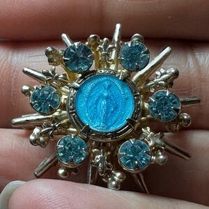 Blessed Mother Pin Brooch Miraculous Medal Blue Enamel Stones VTG Religious 4363