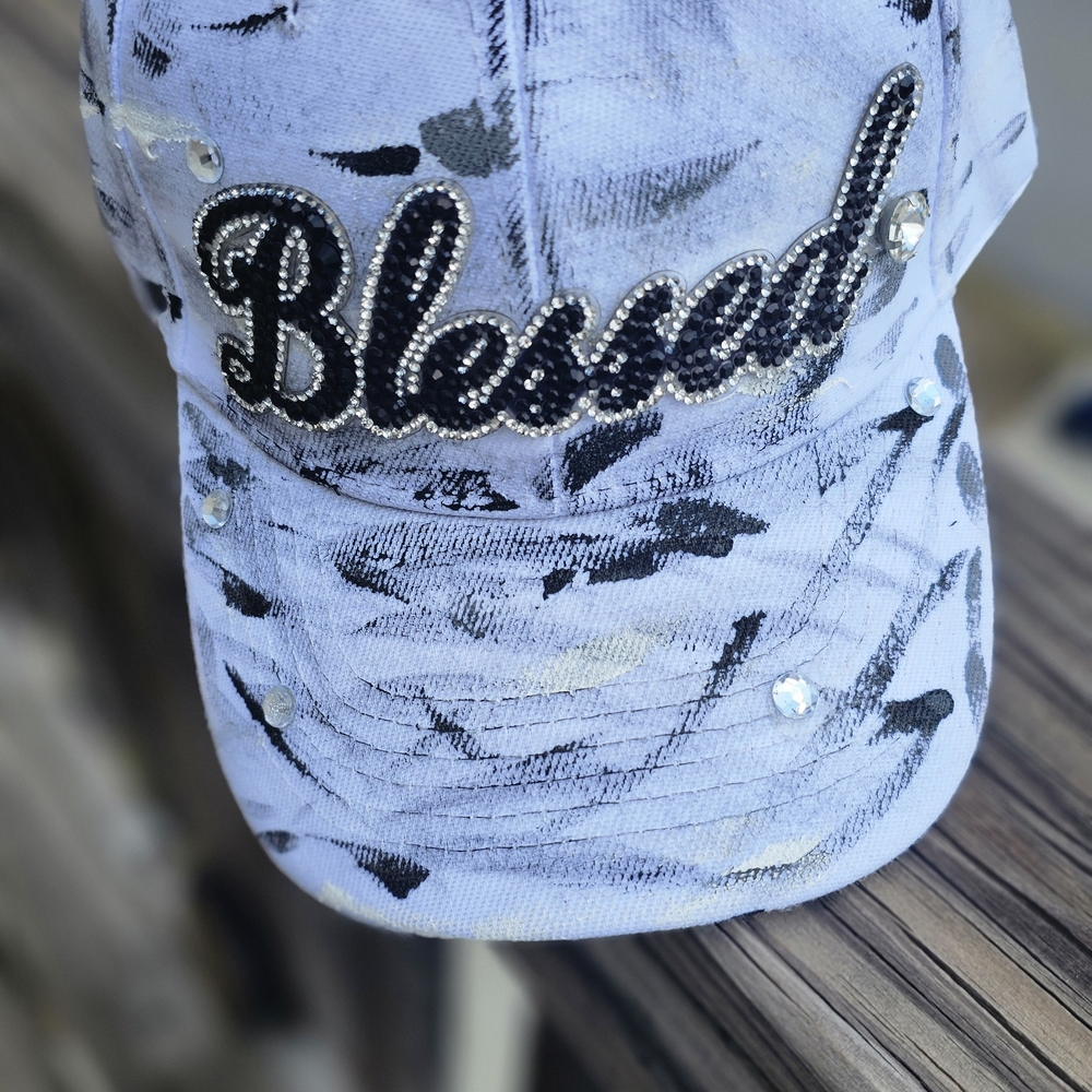 Stylish cap with 'Blessed' in rhinestones. Features a unique black and white pattern.