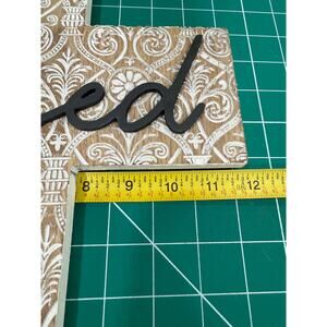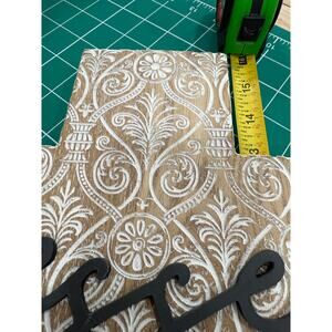 Made from composite wood-style material featuring a carved floral whitewash design and dark lettering.