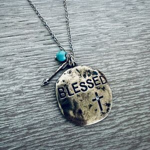 Rustic antiqued gold tone or bronze “Blessed” round circle medallion pendant chain necklace with turquoise blue bead and arrow charms. Excellent like new condition.