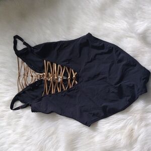 Elegant black swimsuit with a stylish gold accent. Perfect for a chic beach look.