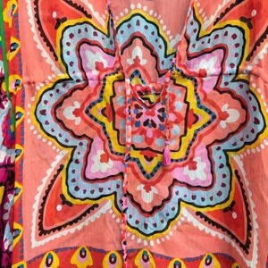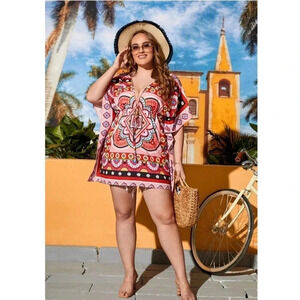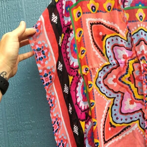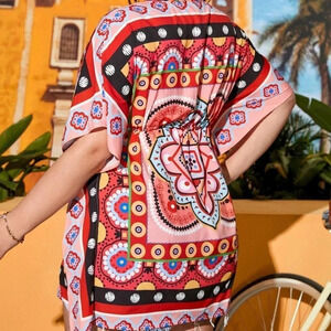 This Bleu Rod Beattie dress features a red boho abstract print, short sleeves, a cinched waist and a mini hem.
