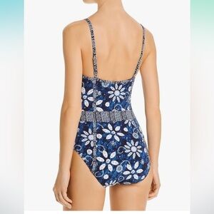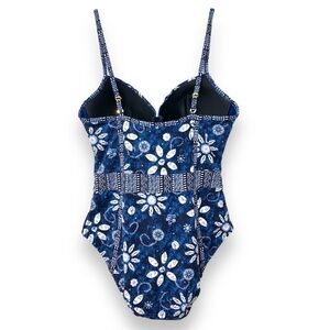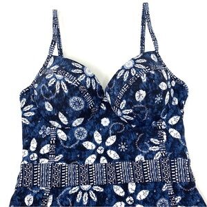 One Piece Deep blue Floral is sexy and sophisticated, with decorative elements that flatter the chest and waist and has bust support with the molded cups. Full bottom coverage. Adjustable shoulder straps. Underwire padded cups. Gorgeous batik like pattern with contrasting bands of blue. Stunning bathing suit! Wish it fit me :o(